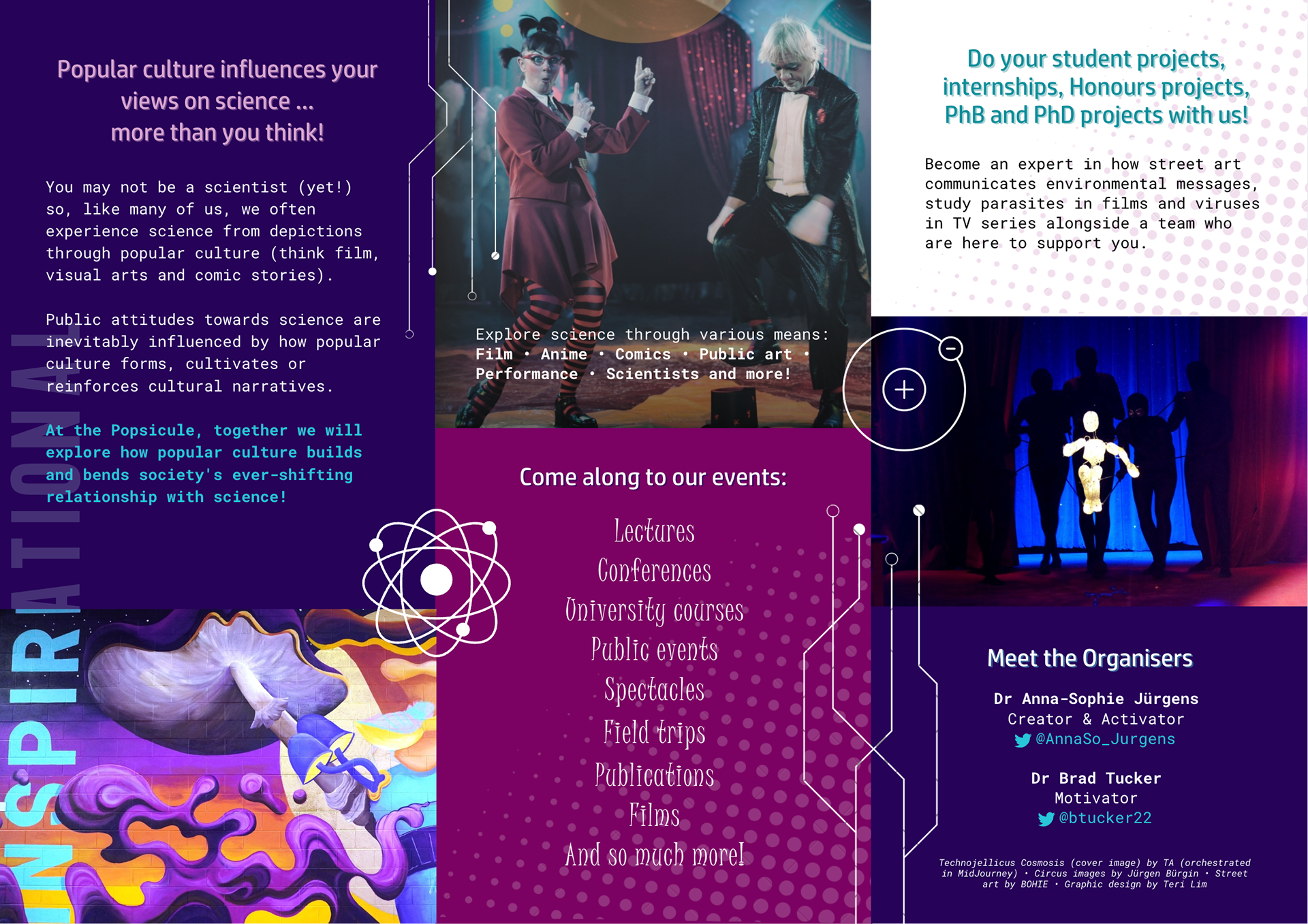 Developed a full brochure concept for POPSICULE, the Science in Popular Culture and Entertainment Hub at the Australian National University (ANU).