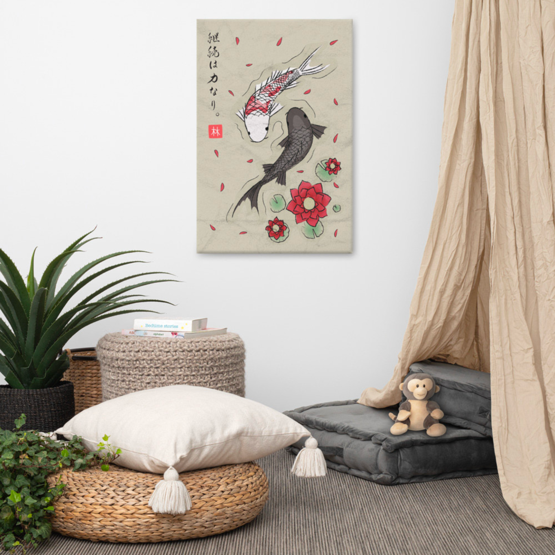 A T-shirt illustration created during my studies that explores the relationship between harmony, consistency and personal growth. The design depicts two koi circling in a yin yang formation with the Japanese phrase “continuity is power”. Together, they express the idea that balance is built through small, repeated actions rather than sudden perfection.