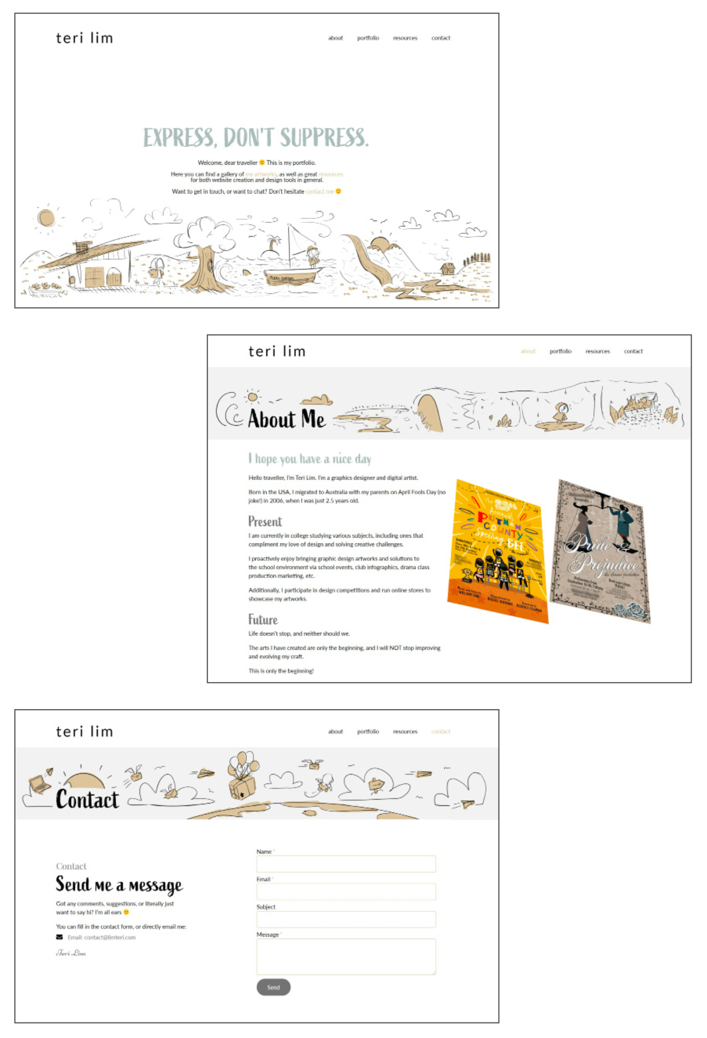 For this project, I designed and built my personal portfolio website, limteri.com. My goal was to create a cohesive and professional online presence by combining my digital illustration skills with clean and purposeful web design. Using Elementor, I planned the site structure with clear navigation across Home, About, Portfolio and Contact pages to ensure a straightforward and intuitive user experience.