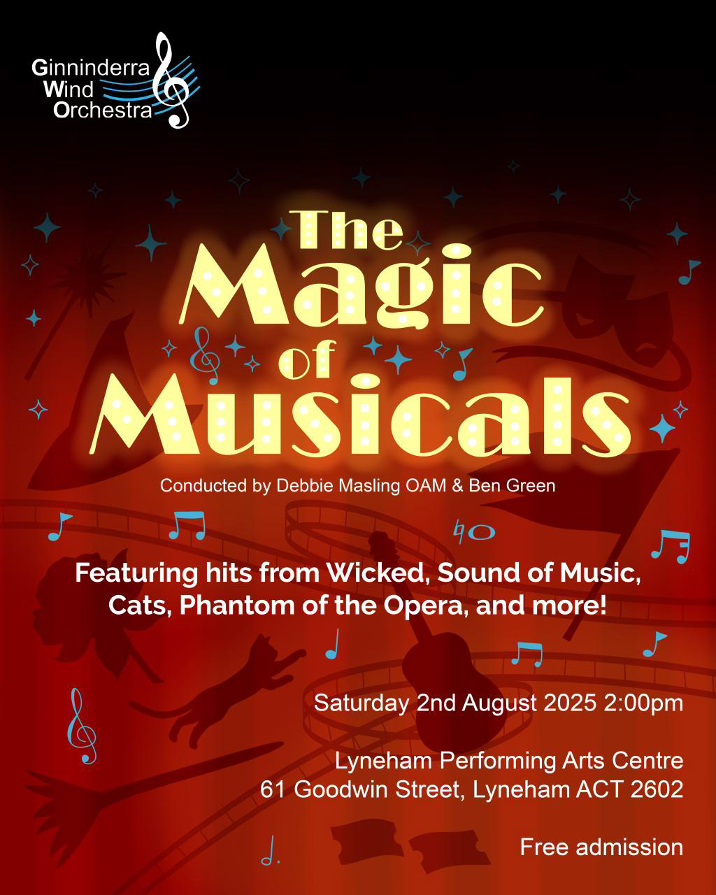 The Ginninderra Wind Orchestra is an 85-musician community ensemble led by Debbie Masling OAM and Ben Green, hosting family-friendly concerts across Canberra and beyond. As part of my voluntary role as Publicity Officer, I designed the poster for our Magic of Musicals concert.